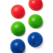 The Sensory Stones set includes six small vinyl stones (about 13 cm diameter × 9 cm high) featuring raised nodules that provide enjoyable tactile and proprioceptive feedback when stepped on, squeezed or explored with hands. These stones can be used as part of obstacle courses, balance and coordination activities, foot wiggle stations or simply as fidget/massage tools during sensory play.